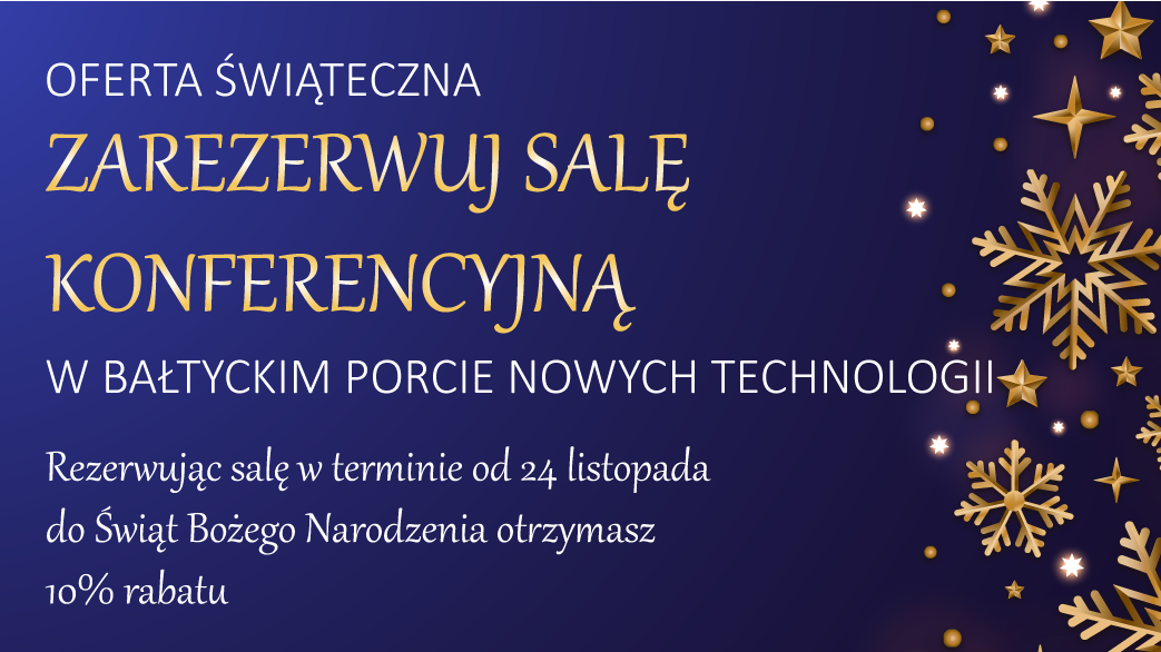 Świąteczne spotkanie przy wspólnym stole w serdecznej atmosferze to doskonały moment na podsumowanie roku, podzielenie się sukcesami oraz podziękowanie pracownikom i partnerom biznesowym. Z tej okazji Bałtycki Port Nowych Technologii przygotował dla Państwa Ofertę Świąteczną, dzięki której dokonując rezerwacji w terminie do 24.12.2021 otrzymają Państwo 10% rabatu*.