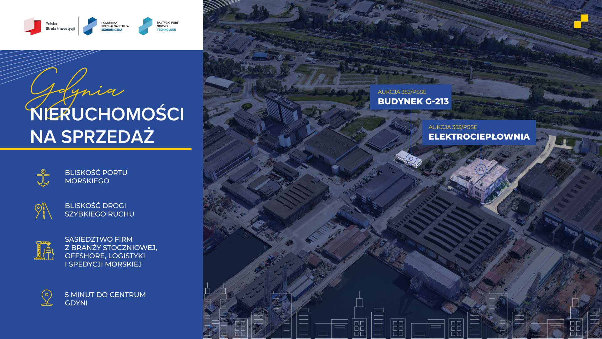Pomorska Specjalna Strefa Ekonomiczna sp. z o.o. z siedzibą w Gdańsku ogłasza aukcję na sprzedaż prawa użytkowania wieczystego nieruchomości położonej w Gdyni oraz prawa własności budynków i budowli stanowiących jej zabudowę.